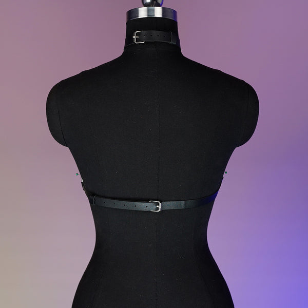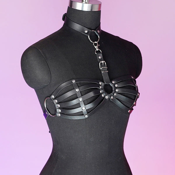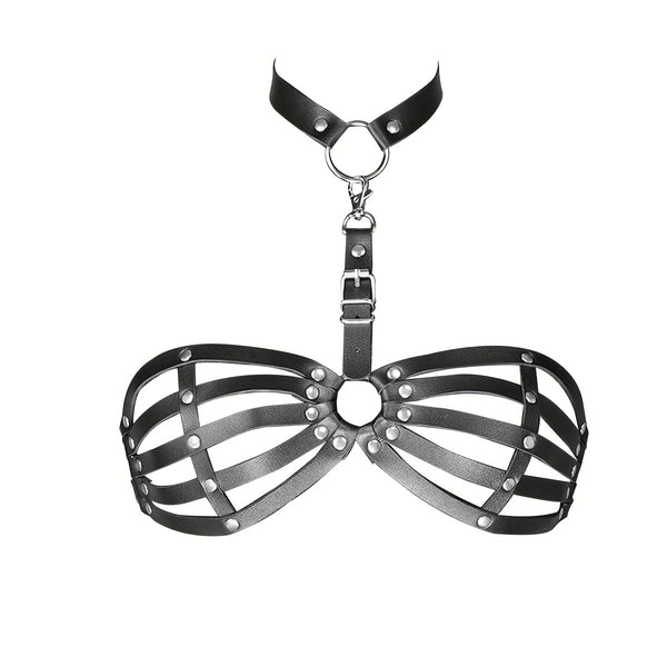 Turn heads with this BadBLingerie chest binder harness, crafted for bold fashion lovers who embrace confidence and edge. Designed with durable PU leather straps, this cage-style bra features riveted detailing, a central O-ring accent, and a removable choker strap that connects elegantly to the chest harness for a striking gothic look.