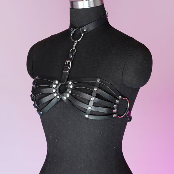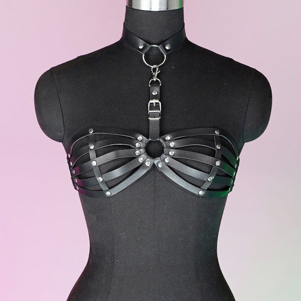 • Cage Bra Design: Open-strap structure with silver rivet details.