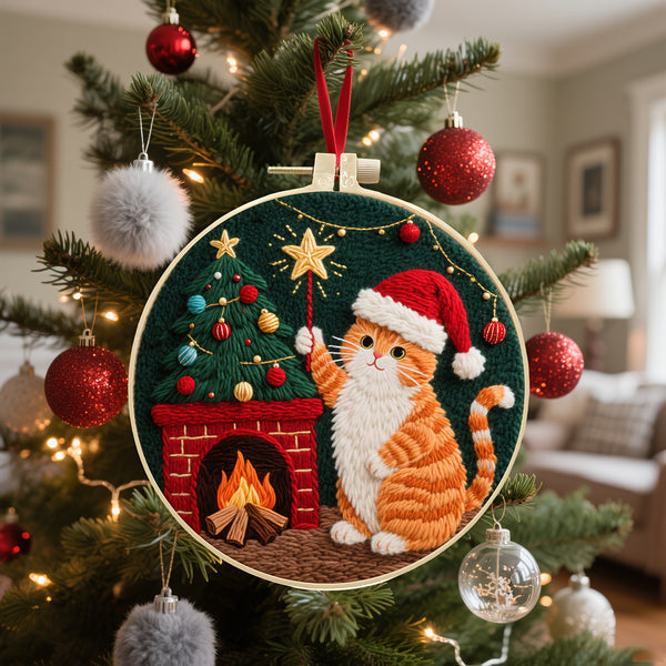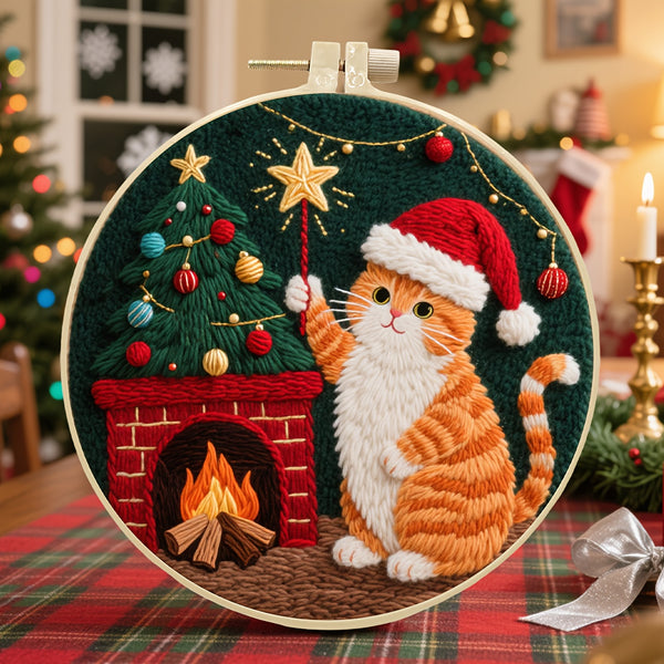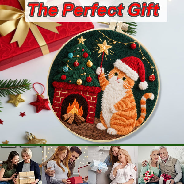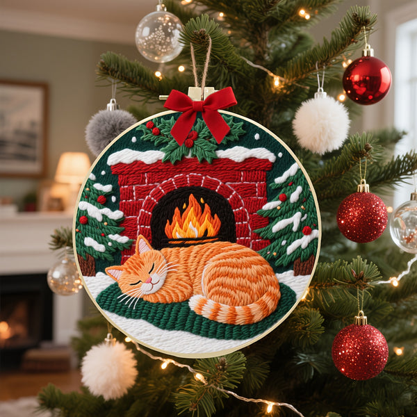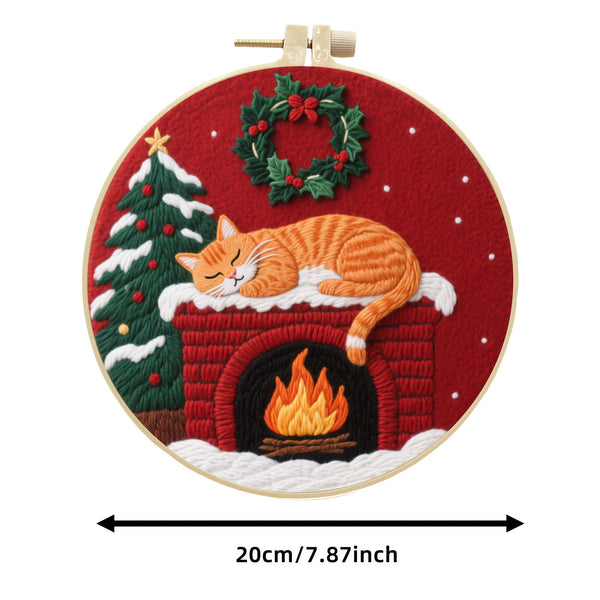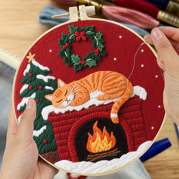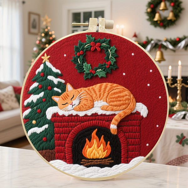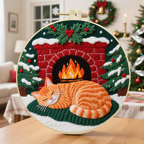 Sleeping Cat by Fireplace Embroidery Kit – Beginner DIY Stitch Set with Printed Pattern, Hoop & Threads | Cozy Holiday Gift Craft