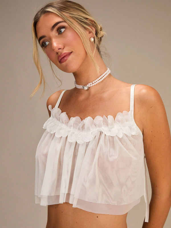 Details: Ruffle hem, floral appliquΓ© trim, sheer mesh layers.