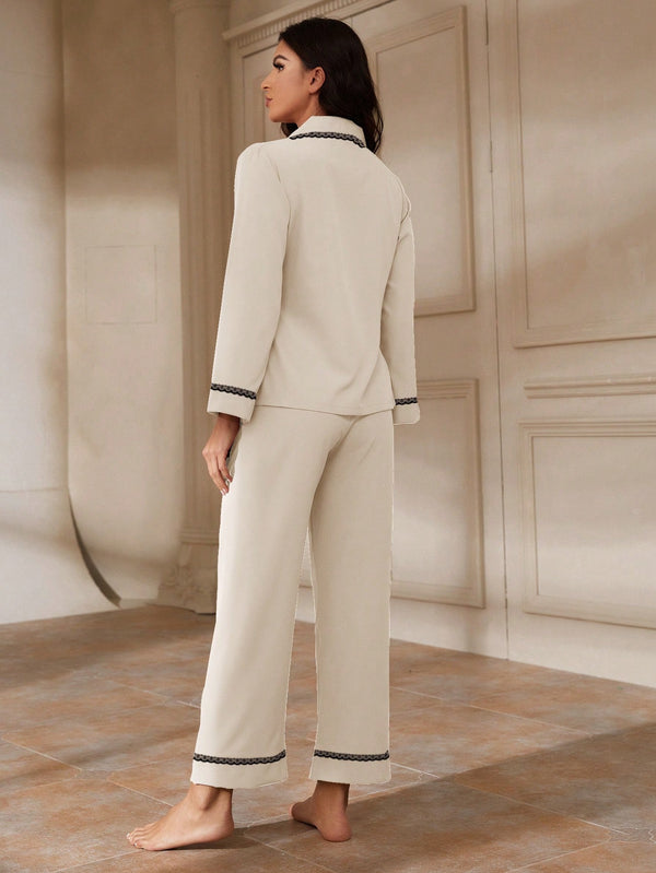 Set Composition: Two-piece pajama set β long-sleeve lapel top and matching full-length pants
