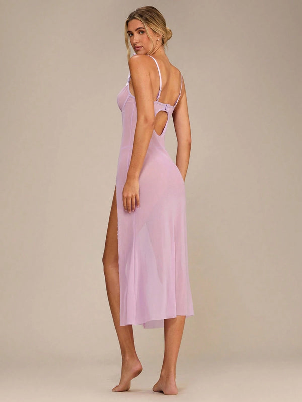 In translucent lilac mesh, its form flows like air, tracing the body with light and shadow.