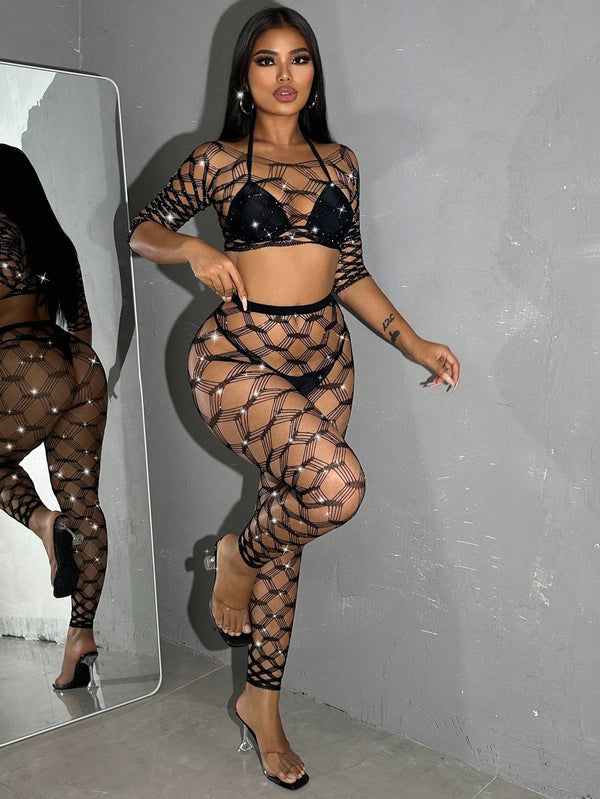 Two-piece set: sheer bodystocking with coordinating bralette and thong