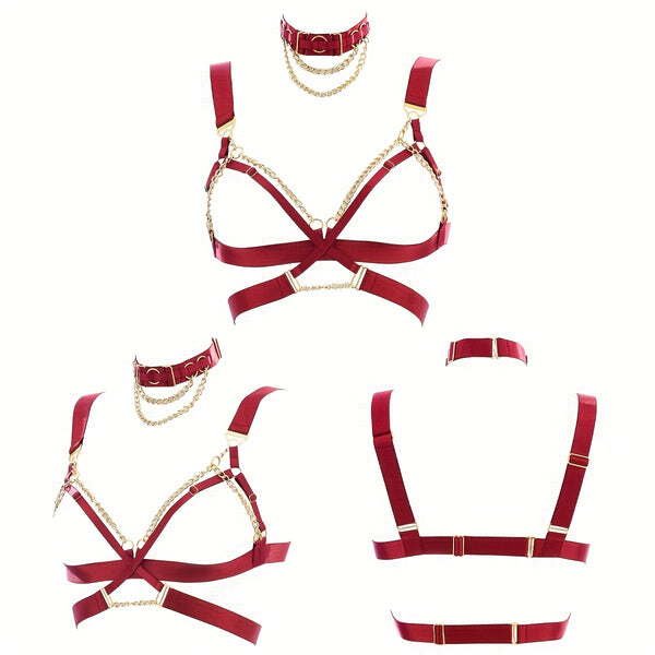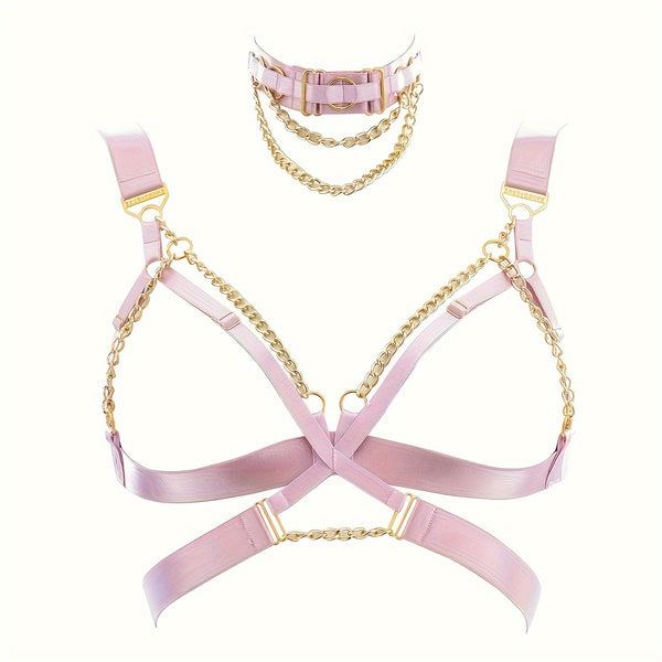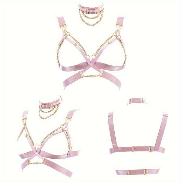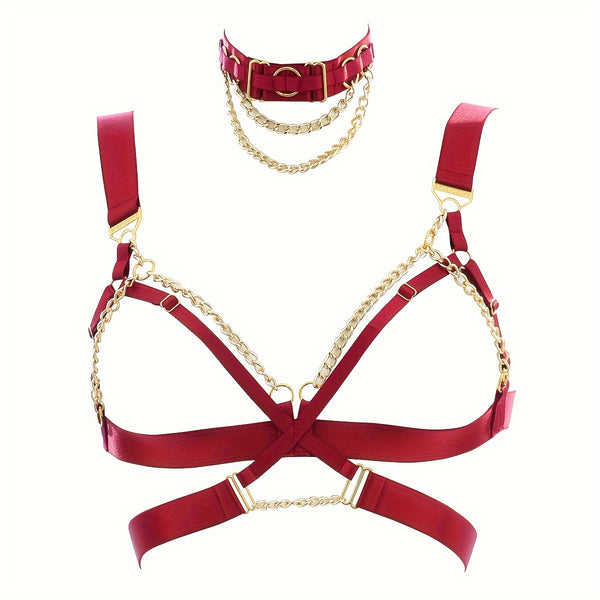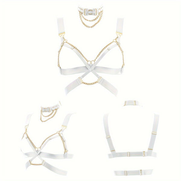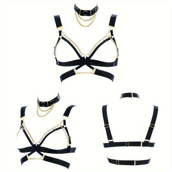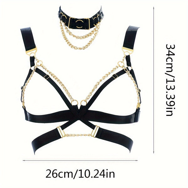 • Two-Piece Set: Includes matching chain choker and harness bra.