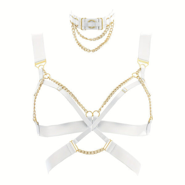 Step into luxury with this stunning BadBLingerie white and gold chain harness set, designed to make a statement. Featuring a sleek white faux leather frame accented by gold-tone metal chains and hardware, this harness bra set includes a matching choker for a cohesive, high-fashion edge.
