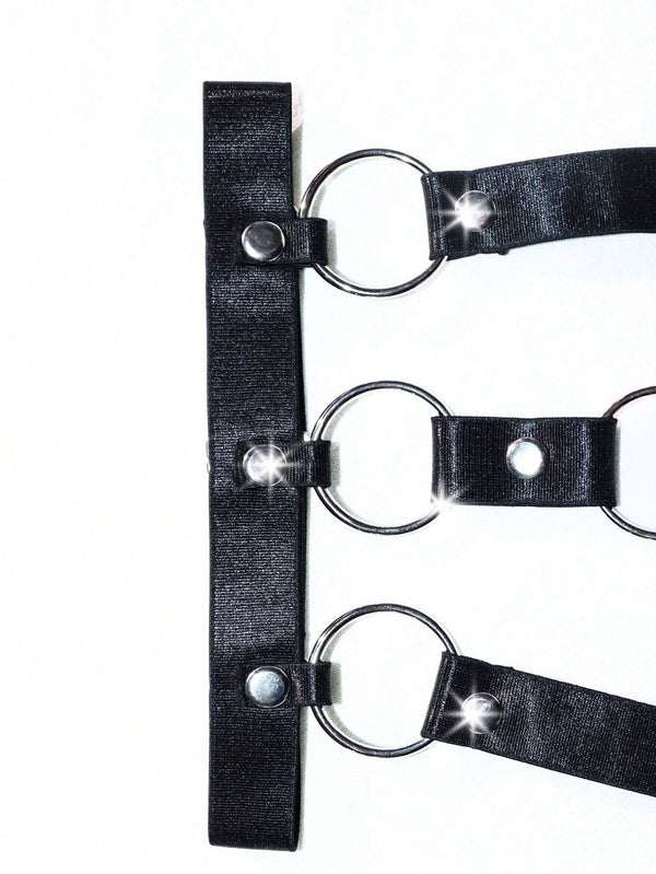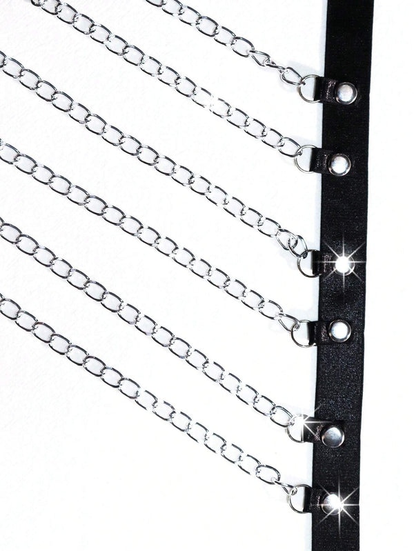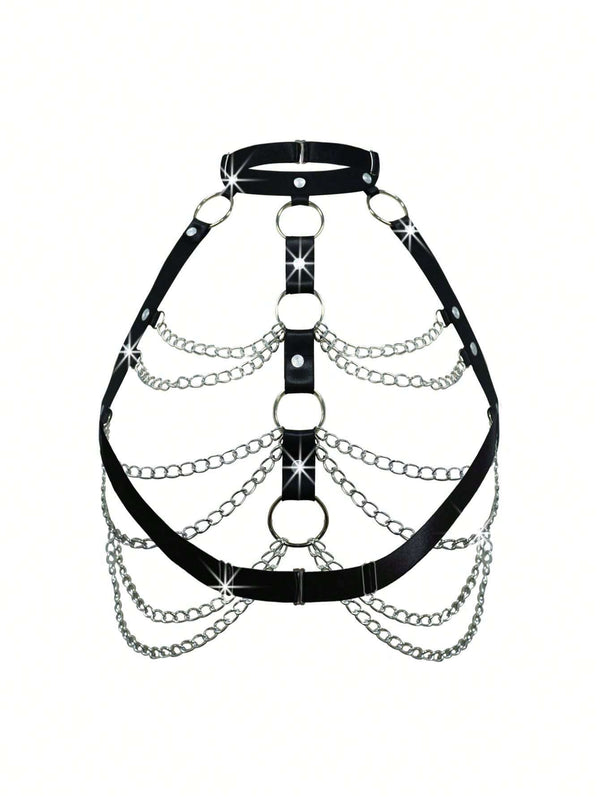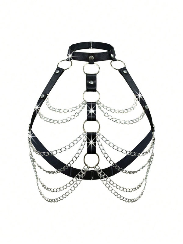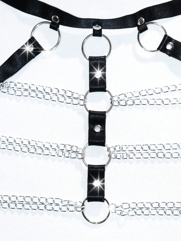 black chain harness, gothic festival top, women’s punk lingerie, body jewelry harness, adjustable strap top, metal chain fashion, alternative outfit accessory, edgy body chain, concert harness top